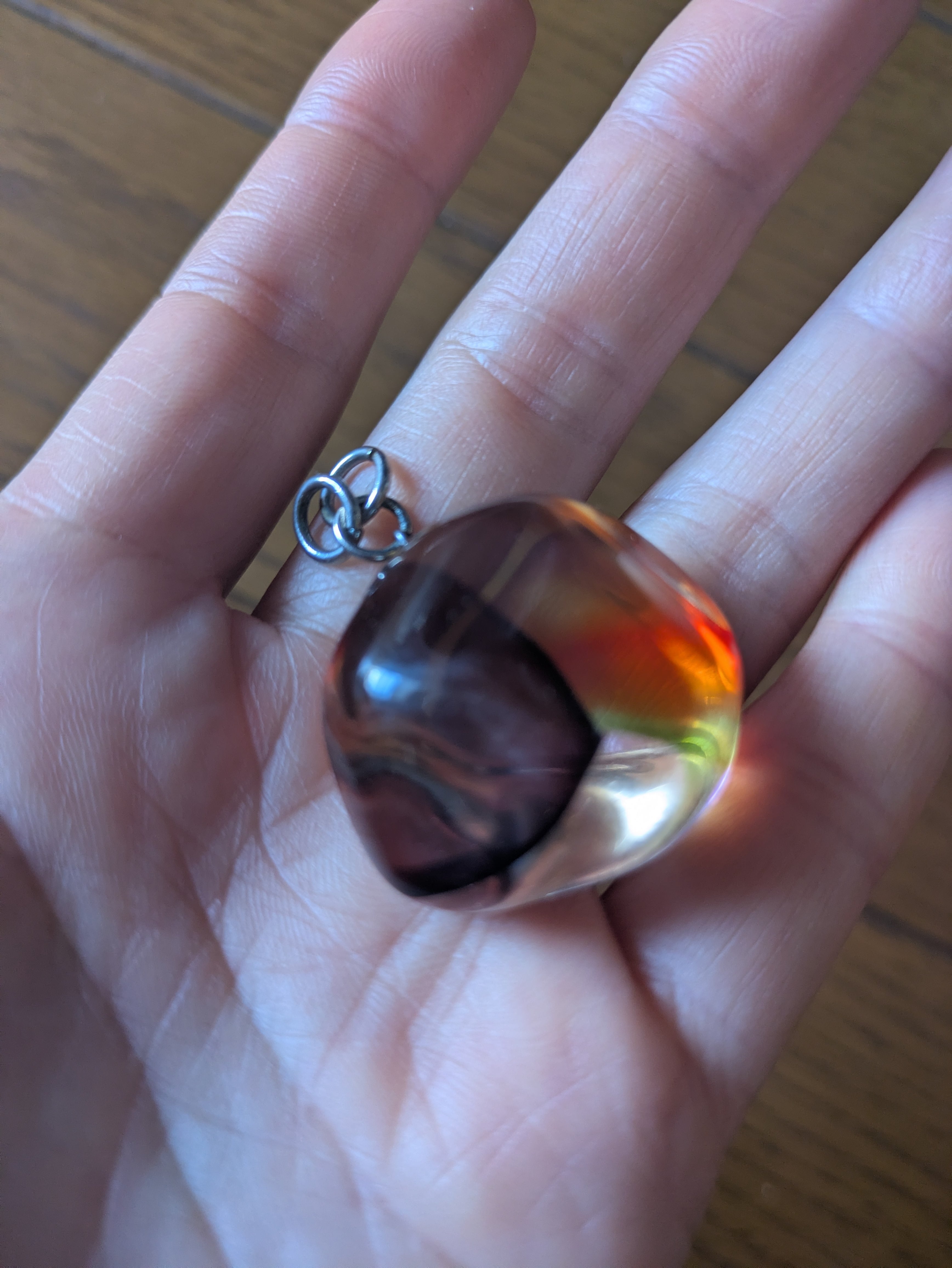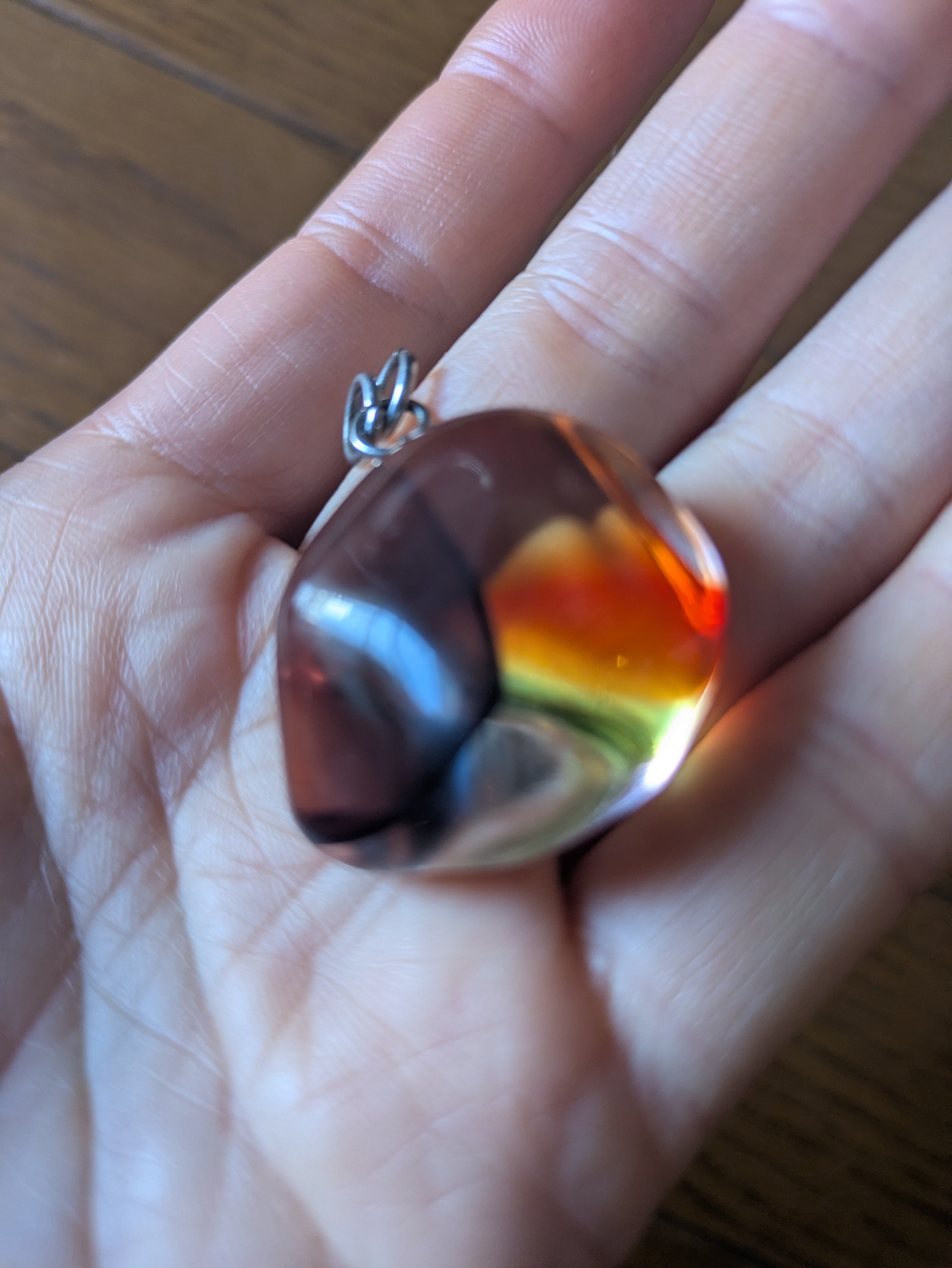 大粒のぽってりとしたガラスの中でパープルとオレンジのカラーがにじむような美しいペンダントは天然石ではありませんが、ユニークで美しいデザイナーの作品です。