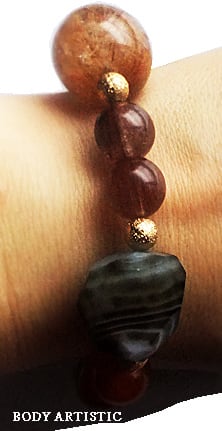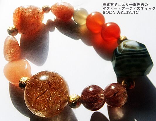 太陽の石として古来から崇められてきた輝く大粒のサンストーン、縞模様が美しいアゲート、ゴールデンルチルクオーツなどごろりとした大粒のオレンジ系の石でまとめられたダイナミックなブレスレットです!