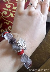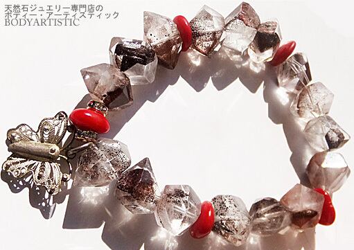 ざっくりした天然のハーキマーのダブルポイントのようなカッティングが魅力の和名、赤富士とも呼ばれるレッドファントムクオーツ、シャンカリでは華麗なる変容を表すバタフライのレースのようなシルバーチャームと赤いコーラルが彩りを添えたちょっぴり高級感のある仕上がりになっています。