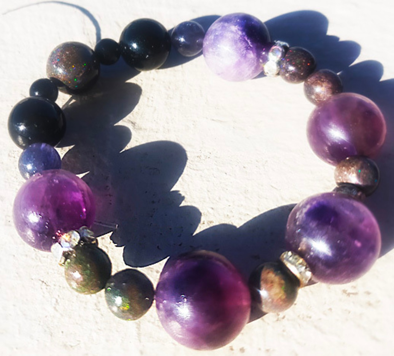 非常に強いパワーを持つと言われる高品質の大玉スーパーセブンをメインに、宇宙のメッセージを伝えているような大小ブラックオパール、ブラックオニキス、ビジョンの石であるウォーターサファイヤ別名アイオライトで贅沢にまとめた、スペシャルなブレスです!